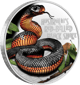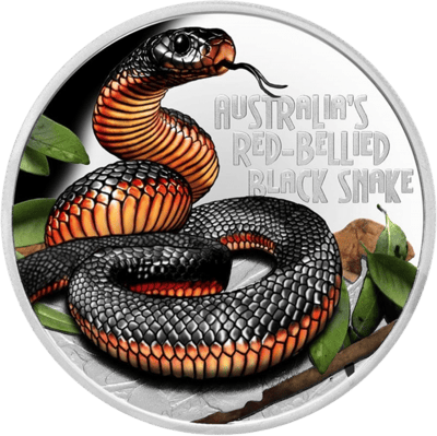 Auf den ersten Blick fallen bei dieser 1 Unze Silber Rotbauch-Schwarzotter sofort die schöne Colorierung und die hochwertige Prägequalität „Polierte Platte“ ins Auge. Sie gehört zu einer Münzserie, die sich thematisch ganz den gefährlichsten Tieren von Australien widmet. Ähnlich wie bei einigen Vorgängern der Sonderausgaben-Münzen ist bei der 1 Unze Silber Rotbauch-Schwarzotter eine lukrative Wertsteigerung möglich – nur 2.500 Stück weltweit gibt es davon. Dank der hochwertigen Colorierung glänzt das Schuppenkleid in schwarzer Färbung mit orange-rotem Bauch, was die Schlange sehr realistisch erscheinen lässt. Hinzu kommt auf der Motivseite noch der Schriftzug „Australia’s red-bellied black snake“. Auf der anderen Seite ist wie gewohnt das Porträt von „Elizabeth II“, eingeprägt, ebenso wie das Herstellungsjahr, der Nennwert und der Feinheitsgehalt.