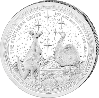 Am unteren Rand der Münze erhebt sich ein stilisierter Sonnenaufgang über dem Horizont. Die Umschrift „THE SOUTHERN CROSS" sowie „1OZ ABC MINT 999 FINE SILVER" rahmen das Motiv ein. Eine griechisch anmutende Bordüre umgibt das gesamte Design und verleiht der Münze einen klassischen, zeitlosen Charakter. Das Kürzel „ABC" am unteren Rand verweist auf den Hersteller ABC Bullion.