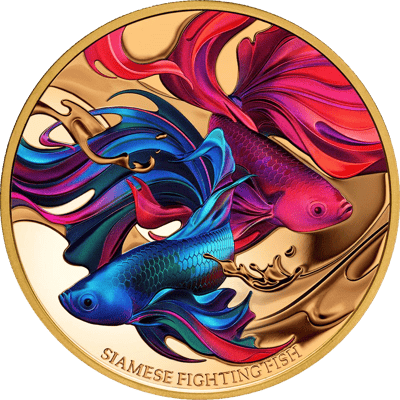 Die Vorderseite der Münze zeigt zwei prächtig colorierte siamesische Kampffische, die in einer dynamischen und anmutigen Pose dargestellt sind. Die leuchtenden Farben von Blau, Rot, Rosa und Grün erwecken die Fische zum Leben und symbolisieren die Leidenschaft und Energie, die diese Wesen ausstrahlen. Der Hintergrund ist mit kunstvollen Wellen und Wirbeln gestaltet, die das Element Wasser repräsentieren und die Bewegung der Fische unterstreichen. Die Inschrift „SIAMESE FIGHTING FISH“ verläuft elegant am unteren Rand der Münze und vervollständigt das Design.