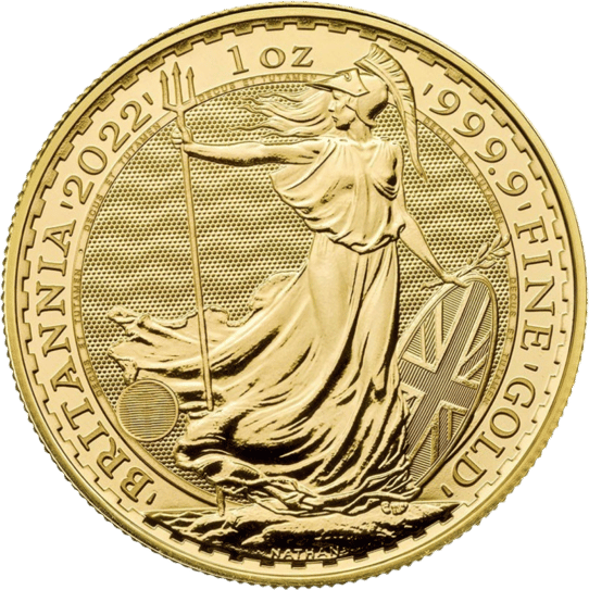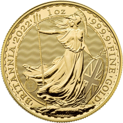 Mit Dreizack, englischem Schild und elegantem Helm steht Britannia selbstbewusst auf einem Fels in der Nähe des Meeres der englischen Küste. In der Hand in der sie ihr Schild hält, das für ihre Funktion als Schutzfigur Großbritanniens steht, hält sie außerdem einen Olivenzweig. Die Münze besitzt auf der Vorderseite die Aufschriften „Britannia 2022“ und „1 OZ 9999 FINE GOLD“.