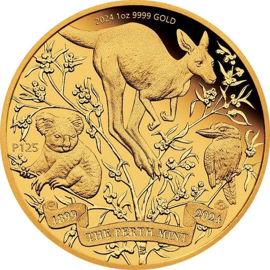 Das Design dieser limitierten Jubiläumsmünze ist eine Hommage an die australische Fauna und Flora. Die Vorderseite ziert ein Ensemble aus den drei bekanntesten Bullion-Motiven der Perth Mint: dem Känguru, dem Koala und dem Kookaburra. Diese sind eingebettet in ein kunstvolles Flechtwerk, das von Australiens nationalem Blumenemblem umrahmt wird. Ein Banner, das stolz das Gründungsjahr 1899, den Namen "Perth Mint" und das Jubiläumsjahr 2024 präsentiert, krönt dieses meisterhafte Design.
