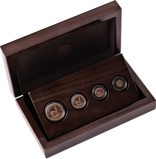 Die vier Münzen ruhen sicher gebettet in einem eleganten, dunkelbraunen Holzetui mit dem eingeprägten Emblem der South African Mint. Dieses hochwertige Etui schützt nicht nur die kostbaren Münzen, sondern unterstreicht auch den exklusiven Charakter dieser Rarität.