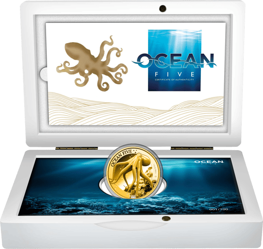 Die 1 Unze Gold Ocean Five Oktopus 2023 PP besteht aus 999,9/1.000 feinem Gold und hat einen Nennwert von 100 Niue-Dollar. Jede Münze ist in einem Durchmesser von 38,60 mm geprägt und hat ein Feingewicht von 31,10 g. Jede Münze ist nummeriert (von 1-100) und wird mit einem Zertifikat sowie einem exklusiven Etui geliefert.