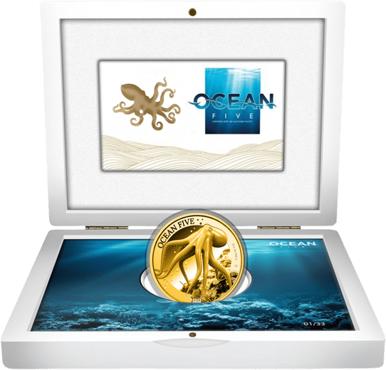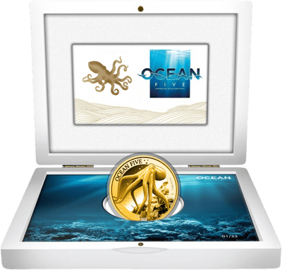 Mit der 5 Unzen schweren Sammlermünze aus der Ocean Five Serie präsentieren wir Ihnen eine absolute Rarität für anspruchsvolle Sammler. Als viertes Motiv der beliebten Unterwasser-Serie zeigt diese Goldmünze einen majestätischen Oktopus, der sich elegant durch eine Korallen-Landschaft bewegt.