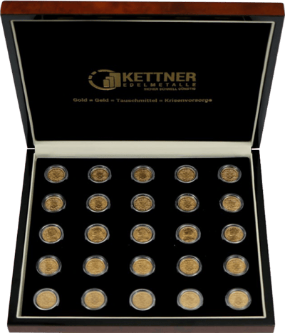 Für alle Freunde der Schweizer Vreneli Goldmünzen bieten wir die Gold Vreneli Box mit 25x 10CHF Vreneli, inklusive Edelholz-Etui an. Die edlen Holzboxen sind maßgefertigt für die Krisenschutzpakete und nur inklusive der 25x 10CHF Gold Vreneli erhältlich. Die Gold Vreneli Box ist für Sie im Preis inklusive. Sie erhalten 25 Stücke im Set. Jede der Münzen wird von Hand in einem Baumwollhandschuh gekapselt.