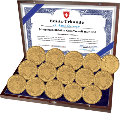 Bis heute werden alle Goldmünzen, die zwischen 1897 und 1949 geprägt wurden, als Vreneli bezeichnet. Ein exklusiver Komplettsatz aus 14 x 20 Schweizer Franken Vreneli-Münzen gilt bei vielen Anlegern als begehrenswert.