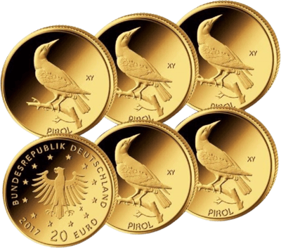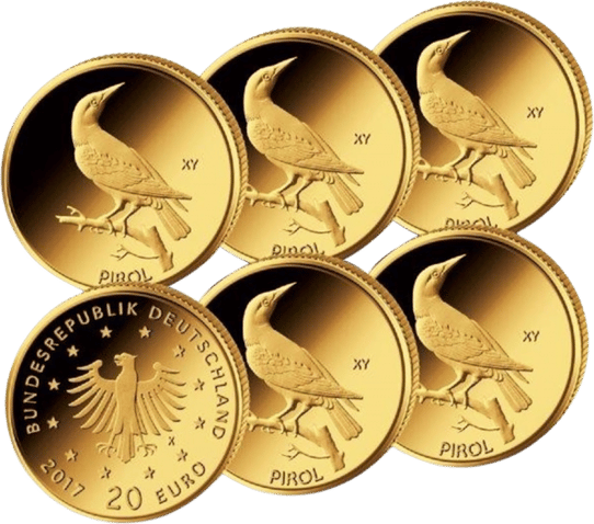 Als zweite Ausgabe der neuen Goldmünzenserie „Heimische Vögel“ erscheint am 23. Juni 2017 diesen Jahres die Goldmünze der “Heimischen Vögel: Pirol”. Die 20 Euro Münze aus reinstem Gold (999,9/1000) wird in der Prägequalität Stempelglanz (st) ausgegeben und mit Original-Kapsel sowie Echtheitszertifikat des Bundesministeriums der Finanzen geliefert. Dabei wird sie unter einer streng limitierten Auflage in den fünf staatlichen Prägestätten der Bundesrepublik Deutschland hergestellt. Die Goldmünze zeigt ein detailgetreues Bild des Pirols. Auflage nur 40.000 Münzen pro Prägezeichen (A,D,F,G und J).