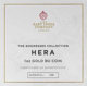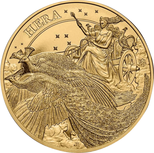 Diese Goldmünze ist der Göttin Hera gewidmet. Die Motivseite zeigt Helga in einer edel aussehenden Kutsche, die einer Göttin würdig ist. Hera trägt ein langes Kleid und hat die Beine überschlagen. Ihre langen Haare wehen im Wind. In der rechten Hand von Hera befindet sich Zepter, der ihre Macht symbolisiert. Um den Zepter herum funkeln viele kleine Sterne. Hera fährt allerdings nicht alleine auf der Kutsche, sondern ist in Begleitung eines Pfaus. Dieser sitzt links neben ihr. Die Kutsche wird auch nicht wie gewöhnlich von Pferden gezogen, sondern von drei sehr großen Pfauen. Der Pfau ist das Lieblingstier von Hera. Sie wird deshalb meistens mit einem Pfau dargestellt. Eine Legende besagt, dass Hera dem hundertäugigen Argos, der von dem Gott Hermes getötet wurde, die Augen entnommen haben soll, um damit die Federn des Pfaus zu schmücken.