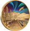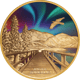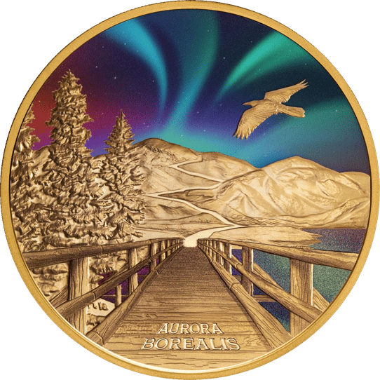 Auf der Vorderseite der Münze ist eine Brücke dargestellt, die über einen See führt. Bäume säumen die Brücke, während im Hintergrund eine Hügellandschaft zu sehen ist. Über dieser Landschaft leuchten die Polarlichter in kräftigen Farben. Dieses Motiv wird durch das Zusammenspiel von Gold und Farbe zu einem einzigartigen Kunstwerk.