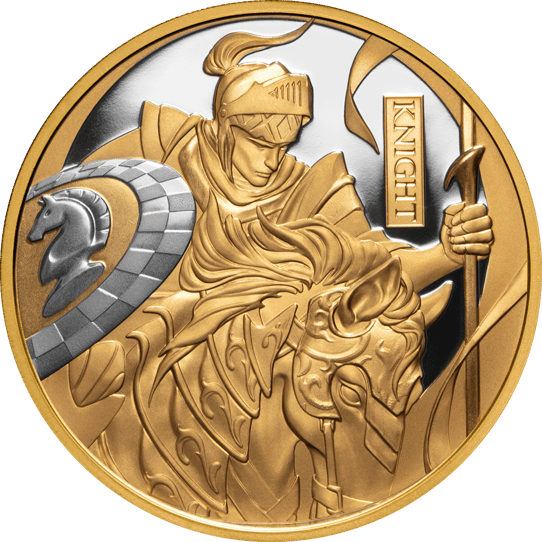 Die Vorderseite der Münze ziert eine teilweise mit Platin beschichtete Darstellung eines Ritters auf einem Pferd, der in voller Rüstung mit Lanze und Schild zu sehen ist. Das Schild zeigt erneut den Spielstein „Pferd“, was der englischen Bezeichnung „Knight“ für den Springer entspricht – ein Detail, das Sammlern die Einzigartigkeit dieses Stücks vor Augen führt. Die Rückseite wird von einem Bildnis von König Charles III. gekrönt, umgeben von Angaben zu Gewicht, Feinheit, Nennwert und dem Ausgabejahr 2024. Jedes Detail wurde mit größter Sorgfalt und in höchster Polierte Platte-Qualität geprägt, was diese Münze zu einem wahren Kunstwerk macht.