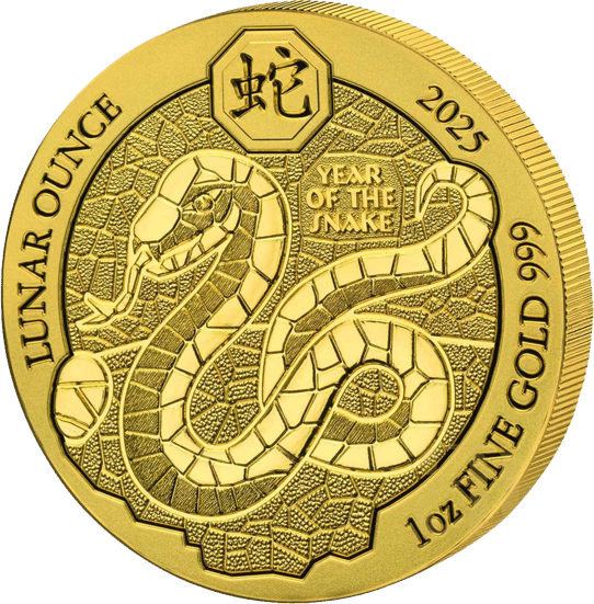 Das faszinierende Mosaikdesign auf der Vorderseite zeigt eine majestätische Schlange, die symbolisch für das Jahr der Schlange im chinesischen Mondkalender steht. Die detailreiche Darstellung der Schlange, umgeben von den Schriftzügen "Lunar Ounce 1oz Fine Gold 999", "2025" und "Year of the Snake", macht diese Münze zu einem echten Kunstwerk. Der Rand der Münze trägt ebenfalls die Inschrift und betont die hohe Qualität und Präzision der Prägung.