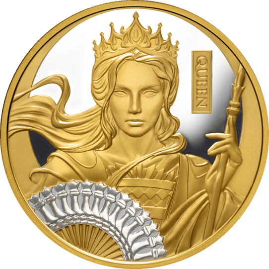 Das majestätische Motiv zeigt eine königliche Dame in prachtvollem Gewand mit Schachbrettmuster. Besonders beeindruckend ist der kunstvoll gestaltete Fächer aus Schachfiguren, der durch eine edle Platinbeschichtung zusätzlich veredelt wurde. Die Rückseite ziert das Portrait von König Charles III. sowie die technischen Angaben zu dieser exklusiven Ausgabe.
