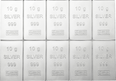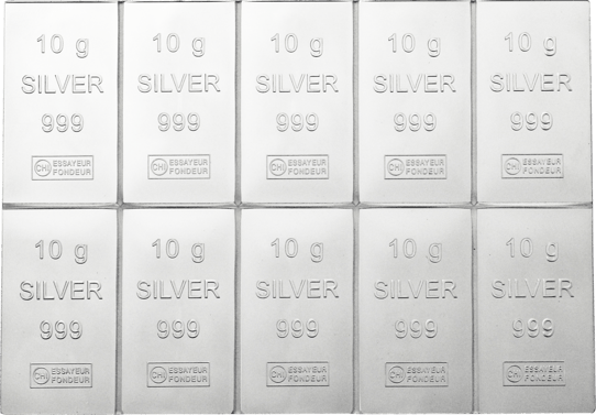 Dieser LBMA-zertifizierte Tafelbarren Combibarren ist, wie der Name bereits andeutet, eine Kombination aus mehreren Silberbarren, nämlich insgesamt zehn Stück. Jeder einzelne Silberbarren hat eine Feinheit von 999/1.000 und ein Gewicht von 10 Gramm. Diese Angaben sind auf der Vorderseite der Barren eingeprägt.