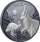 Auf der Vorderseite der Münze sind zwei australische Felskängurus bei Nacht abgebildet, die in ihrem natürlichen Lebensraum in den felsigen Regionen Australiens beheimatet sind. Dieses atemberaubende Motiv wird durch einen leuchtenden Vollmond und den Sternenhimmel noch beeindruckender.
