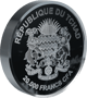 Die Vorderseite der Münze zeigt einen eindrucksvollen Löwen mit aufgerissenem Maul, umgeben von einer detaillierten Steppenlandschaft, die einen Berg, typische Bäume und einige Elefanten zeigt. Die Szenerie wird durch den Schriftzug "African Safari II" und eine individuelle Nummerierung vervollständigt, die jede Münze zu einem Unikat macht. Auf der Rückseite wird das Wappen der Republik Tschad präsentiert, ergänzt durch den Nennwert von 5.000 Francs.
