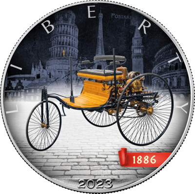 Die Vorderseite der Münze zeigt eine farbenprächtige Darstellung des ersten Motorwagens von Carl Benz, der 1886 das Patent anmeldete. Das Ausgabejahr der Münze, "2023", ist am unteren Münzrand zu sehen, während die Aufschrift "LIBERTY" majestätisch den oberen Münzrand säumt.