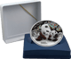 Die Vorderseite der Münze zeigt ein kunstvoll gestaltetes Motiv von zwei Pandabären – ein erwachsener und ein junges Tier, die in harmonischer Ruhe nebeneinander sitzen. Der erwachsene Panda umarmt das Jungtier liebevoll, eine Szene, die das Herz eines jeden Betrachters erwärmt. Die detailreiche Ausarbeitung der Fellstrukturen und die lebhaften Augen der Pandas sind ein Beweis für die handwerkliche Exzellenz der China Mint. Über ihnen schimmert ein Bogen aus farbigen Blättern in einem Spektrum aus Rot-, Grün- und Blautönen, was einen beeindruckenden Regenbogeneffekt kreiert.