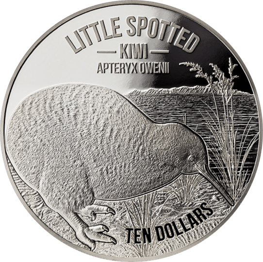 Das Motiv zeigt uns einen Kiwi bei der Suche nach Nahrung, im Hintergrund ist ein Gewässer zu sehen, sowie eine Bergkette, also eine typische neuseeländische Landschaft. Über dem Motiv ist der englische, sowie der lateinische Begriff für den Vogel aufgeprägt. Ebenfall ist der Nennwert von 10 Dollar zu sehen. Auf der Rückseite ist das Portrait der Queen Elisabeth II zu sehen, dem Ausgabejahr sowie das Gewicht und die Feinheit.