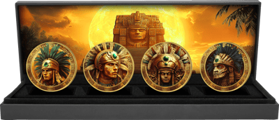 - Hochwertige Veredelung: Teilvergoldete und kolorierte Münzen in faszinierender Azteken-Optik