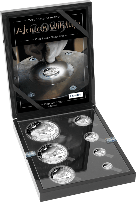 Silber Somalia Elefant First Struck Set 2023 (Auflage: 300 Stück)