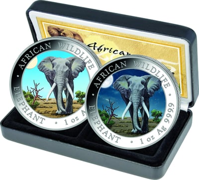 Mit einer Auflage von nur 500 Stück weltweit ist dieses Set eine echte Rarität. Jede der beiden Münzen zeigt einen majestätischen Elefanten in einer beeindruckenden afrikanischen Landschaft – eine bei Tag, die andere bei Nacht. Diese kunstvolle Darstellung macht das Set zu einem begehrten Sammlerstück.