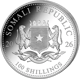 Auf der Rückseite präsentiert sich das Staatswappen der Republik Somalia in seiner ganzen Pracht. Zwei Leoparden flankieren das Wappenschild, das von Speeren und Palmzweigen umgeben ist. Die Umschrift "SOMALI REPUBLIC" sowie die Jahreszahl "2026" und der Nennwert "100 SHILLINGS" vervollständigen das würdevolle Design.