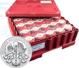 Diese beeindruckende rote Masterbox ist weit mehr als nur eine Verpackung. Sie ist ein durchdachtes Lagersystem, das Ihre 500 Unzen Feinsilber perfekt schützt. Die robuste Kunststoffbox mit Klappdeckel und sicherem Verschlussmechanismus beherbergt 25 rote Münztubes mit jeweils 20 Münzen. Jede Tube ist mit weißen Deckeln versehen, die deutlich mit "SILVER" und "1 Ounce Silver" beschriftet sind. Das macht nicht nur die Handhabung kinderleicht, sondern verleiht Ihrer Investition auch eine professionelle Note.
