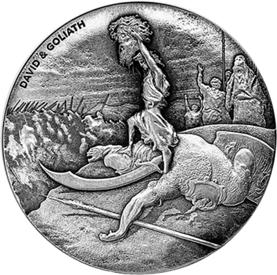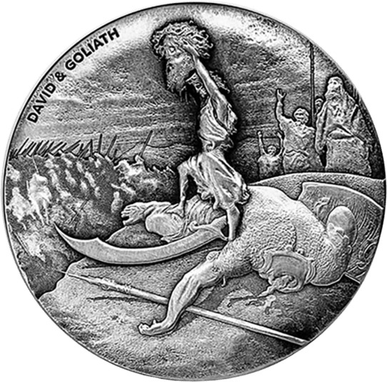 - Inspiriert von Gustave Doré’s Illustration der “David & Goliath”, welche auf der Münze dargestellt sind.