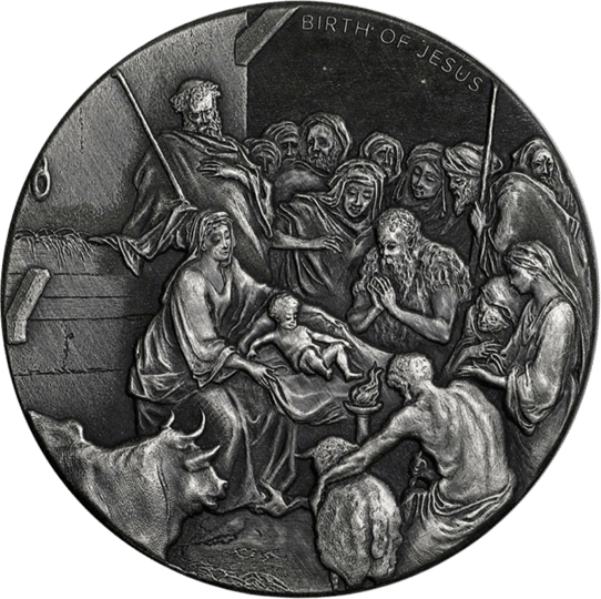 - Inspiriert von Gustave Doré’s Illustration der Geburt Jesus, welcher auf der Münze dargestellt wird.