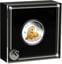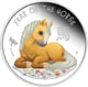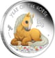 Das entzückende Motiv zeigt ein goldgelbes Baby-Pferd, das friedlich auf einer blumenübersäten Wiese ruht. Die seidig schimmernde Mähne und der Schweif des kleinen Fohlens sind in zartem Silbergrau gehalten. Eine verspielte Libelle schwebt links neben dem Pferdchen und verleiht der Szene zusätzliche Lebendigkeit. Das chinesische Schriftzeichen für "Pferd", die Aufschrift "Year of the Horse" sowie das renommierte Münzzeichen "P" der Perth Mint runden das kunstvolle Design ab.