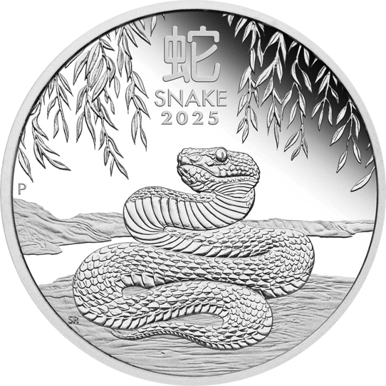 Die Vorderseite der Münze zeigt eine detailliert gravierte Schlange, die sich majestätisch auf einer ebenen Fläche windet. Die texturierte Haut der Schlange mit ihren sichtbaren Schuppen und der erhobene Kopf verleihen dem Motiv eine beeindruckende Realitätsnähe. Umgeben von stilisierten Pflanzen und Ästen, die den Rand der Münze berühren, wird das Hauptmotiv kunstvoll eingerahmt. Das chinesische Schriftzeichen für Schlange, der Schriftzug "SNAKE 2025" sowie das Münzzeichen "P" und die Initialen "SR" des Designers runden das Design ab.