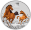 Die Motivseite dieser prächtigen 2-Unzen-Münze zeigt zwei kraftvolle Pferde in voller Bewegung. Das größere Pferd mit seiner wallenden dunklen Mähne scheint förmlich aus der Münze herauszuspringen, während das jüngere Fohlen daneben spielerisch galoppiert. Die aufwendige Colorierung in warmen Brauntönen verleiht den Tieren eine lebensechte Ausstrahlung. Im Hintergrund erstreckt sich eine sanfte Berglandschaft, während das chinesische Schriftzeichen für "Pferd" (馬) zusammen mit der englischen Bezeichnung "HORSE" und dem Prägejahr 2026 das Design komplettiert. Das "P" als Prägezeichen der Perth Mint zeugt von der australischen Herkunft.