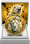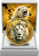 Schon beim ersten Blick auf diese Münze wird klar: Hier hat jemand mit Leidenschaft gearbeitet. Die Vorderseite zeigt das Porträt eines weißen Löwen in einer Nahaufnahme, die jedes einzelne Haar der imposanten Mähne sichtbar macht. Seine bernsteinfarbenen Augen blicken den Betrachter direkt an – durchdringend, stolz, beinahe lebendig. Goldene Blattgold-Partikel scheinen über das Fell zu tanzen und verschmelzen mit dem warm schimmernden, teilvergoldeten Hintergrund. Der geriffelte Rand der Münze fasst das Motiv wie ein kostbarer Rahmen ein.