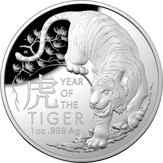 Die Wertseite der Münze zeigt das berühmte Portrait von Königin Elizabeth II, umgeben von den zwölf Tierkreiszeichen des chinesischen Mondkalenders. Das aktuelle Zeichen, der Tiger, ist auf der 12-Uhr-Position über dem Portrait platziert. Das Portrait ist von den Schriftzügen "ELIZABETH II", "AUSTRALIA 2022" und "5 DOLLARS" umrahmt.