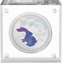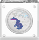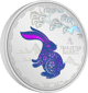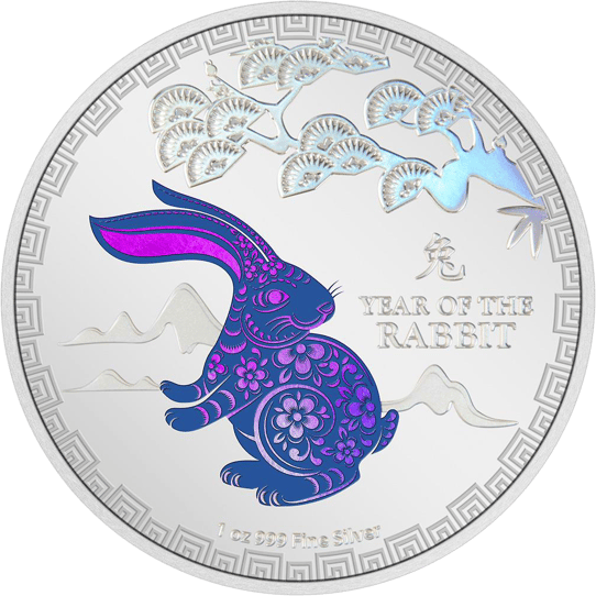 Auf der Motivseite dieser Silbermünze ist ein Hase eingeprägt, der in lila koloriert und mit einem rosa Blumenmuster geschmückt wurde. Über dem Hasen ist ein außergewöhnlicher Baum zu sehen, dessen Blätter und Stamm türkisfarben sind. Unter einem der Blätter stehen das chinesische Zeichen für Hase sowie der Schriftzug Year of the Rabbit.