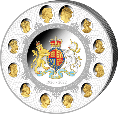 Die exklusive 1 Kg limitierte Silber-Gedenkmünze von Queen Elizabeth II. zeichnet sich durch seine unverwechselbare, edle Ästhetik und sein atemberaubendes Design aus. Beeindruckend ist nicht nur die 5.000-Francs-Stückelung, sondern auch die einzigartige Ausführung. Die Motivseite ist mit dem königlichen Wappen in der Mitte von Elizabeth II. mit ihrem Geburtsjahr verziert, umgeben von Portraits von 10 früher herrschenden Königinnen und Königen. Das Gesicht wird mit den Schriften „ELIZABETH ll. QUEEN OF THE UNITED KINGDOM OF GREAT BRITIAN AND NORTHERN IRELAND“. Auch die reizvolle Rückseite mit einem einseitigen Portrait von Queen Elizabeth ll. und den Worten „Elizabeth ll. 5.000 FRANCS CFA, REPUBLIC OF CAMEROON“ und dem Ausgabejahr 2022.