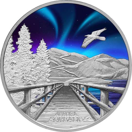 Die Münze ist den als Aurora Borealis bezeichneten Polarlichtern gewidmet, die auf der Nordhalbkugel auftreten. Das Motiv präsentiert das Naturschauspiel in faszinierenden Violett- und Blautönen. Die untere Münzhälfte zeigt eine Darstellung eines Steges, der inmitten der friedlichen skandinavischen Landschaft über einen See führt. Diese Szenerie wird von der gravierten Inschrift "AURORA BOREALIS" ergänzt.