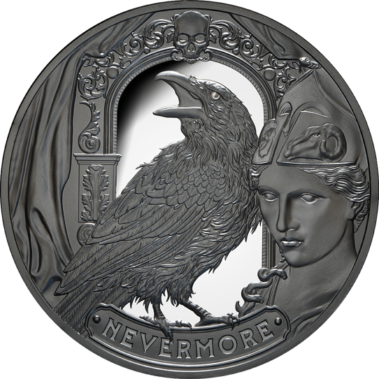 Das Hauptmotiv der Münze präsentiert sich in einem faszinierenden High Relief und zeigt den ikonischen Raben, der auf dem Schriftzug "NEVERMORE" thront. Die bedrohliche Atmosphäre wird durch das innovative Black Proof-Finish perfekt unterstrichen. Zusammen mit der detaillierten Darstellung der Pallas Athene und den kunstvollen gotischen Elementen entsteht ein Gesamtkunstwerk von höchster Prägequalität.