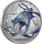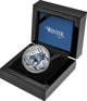 In kühlen Blau- und Grüntönen erstrahlt der stilisierte Wolf auf der Vorderseite dieser außergewöhnlichen Silbermünze. Umgeben von kahlen Ästen, funkelnden Sternen und zwei mystischen Raben, symbolisiert er Stärke, Instinkt und die unbändige Kraft der Natur. Die verschneite Landschaft verleiht dem Motiv eine fast magische Atmosphäre – ein Kunstwerk, das die stille Erhabenheit des Winters perfekt einfängt.