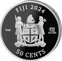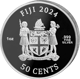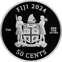 Auf der Rückseite präsentiert sich das offizielle Staatswappen der Fiji Islands in seiner ganzen Pracht. Flankiert von zwei traditionell gekleideten Figuren, zeigt das Wappen ein Segelboot sowie verschiedene symbolträchtige Elemente. Die Angaben "FIJI 2024", "1oz", ".999 FINE SILVER" und der Nennwert von "50 CENTS" vervollständigen das edle Erscheinungsbild.
