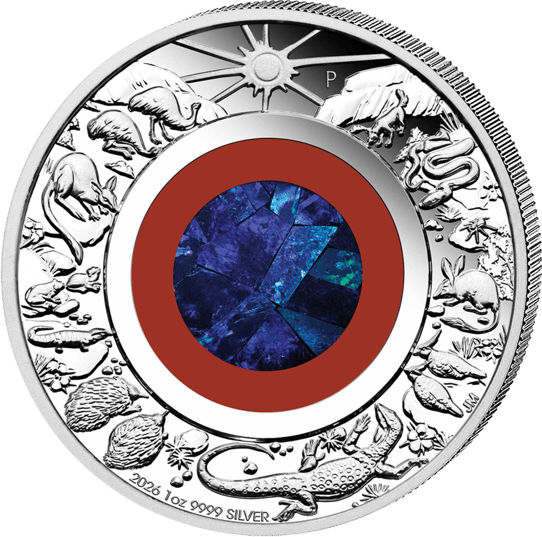 Das Herzstück der Motivseite bildet ein echter australischer Opal, eingefasst in einen rötlich-braunen Ring, der an die eisenhaltige Erde des Outbacks erinnert. Dieser Opal schimmert in tiefen Blau- und Türkistönen – kein Stück gleicht dem anderen, was jede einzelne Münze zu einem absoluten Unikat macht. Um diesen leuchtenden Kern herum entfaltet sich ein atemberaubendes Panorama der australischen Tierwelt: Kängurus springen durch die Landschaft, ein Krokodil gleitet am unteren Rand entlang, Emus recken ihre Hälse, Schlangen winden sich zwischen Felsformationen, und selbst das scheue Schnabeltier hat seinen Platz gefunden. Über allem thront eine stilisierte Sonne mit dem „P"-Mintzeichen der Perth Mint. Die Inschrift „2026 1oz 9999 SILVER" am unteren Rand bestätigt Gewicht und Reinheit.