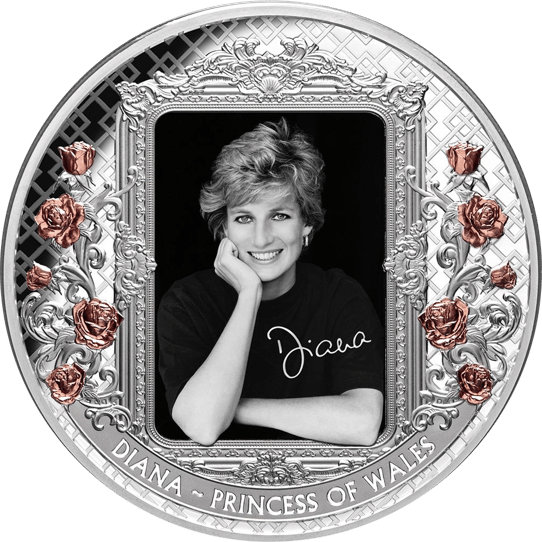 Auf der Vorderseite dieser Silbermünze ist Lady Diana zu sehen, die ehemalige Prinzessin von Wales, die auch liebevoll als Königin der Herzen bezeichnet wird. Das Schwarz-Weiß-Porträt von Diana ist mit einem Autogramm Dianas verziert und von einem wunderschönen Rahmen umgeben. Die Rosenblüten, die Teil des Rahmens sind, wurden vergoldet.