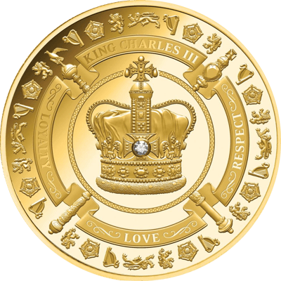 Um die bevorstehende Krönung gebührend zu feiern, wurde diese wertvolle Goldmünze ausgegeben. Die Münze besteht aus einer Unze 999.9% reinem Gold und zeigt ein Motiv einer Krone, die mit einem echten Diamanten besetzt ist. Rund um die Krone sind die Worte „KING CHARLES III“, „LOYALTY“, „RESPECT“ und „LOVE“ angeordnet. Die Münze ist mit verschiedenen heraldischen Symbolen verziert, darunter die Tudor Rose, die Löwen von England und Schottland, die Harfe von Irland sowie zwei Zepter der britischen Kronjuwelen. Die schöne Rückseite zeigt das Wappen von Niue, sowie den Nennwert, das Ausgabejahr und die Feinheit. Die Münze wird während der Krönung von König Charles III. vorgestellt.