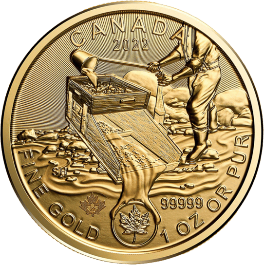 Eine wunderschöne Münze aus Gold, die den Klondike Goldrausch als Motiv-Prägung darstellt. Zusammen mit der Feinheit, dem Prägejahr und der Stückelung ist auf der Motivseite der kraftvolle Bergmann zu erkennen, der Gold mit Hilfe einer Waschpfanne abbaut und Wasser zur Klärung und “Reinigung” in die Kiste schüttet. Zusätzlich ist das traditionsreiche, kanadische Ahornblatt im unteren Bereich zu erkennen. Zusätzlich ist auf der Münze ein mikrograviertes Ahornblatt im unteren Teil linksseitiug zu sehen, in der Mitte  ist ebenfalls das Prägejahr „22“ sichbar.
