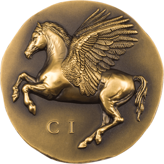 Geprägt ist diese stark limitierte Goldmünze mit dem Pegasos, einem geflügelten Pferd, welches aus der griechischen Mythologie stammt und heute ein weltweit bekanntes Fabelwesen ist.