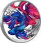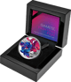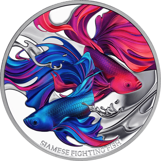 Das faszinierende Motiv der Münze zeigt zwei in prächtigen Farben leuchtende Siamesische Kampffische, die sich in einem Tanz aus Eleganz und Anmut bewegen. Ihre fließenden Flossen und Schwänze sind in lebendigen Blau-, Lila-, Türkis- und Rottönen mit pinkfarbenen Akzenten gestaltet, was in Kombination mit dem silberfarbenen Hintergrund mit feinen Wellen- und Wassertropfen-Designs eine Szene voller Dynamik und Lebensfreude kreiert. Der eingravierte Schriftzug „SIAMESE FIGHTING FISH“ am unteren Rand der Münze rundet das Gesamtbild harmonisch ab.
