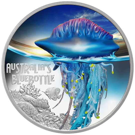Die Portugiesische Galeere, oder auch "Portuguese man o' war" genannt, ist bekannt für ihre beeindruckenden Tentakeln, die bis zu 50 Meter lang werden können und ein starkes Gift enthalten. Die Perth Mint hat es geschafft, die Schönheit und das Wesen dieses gefährlichen Geschöpfs auf einer Münze zu verewigen. Das teilbefärbte Motiv auf der Münze zeigt eine detailreiche und lebendige Darstellung der Portugiesischen Galeere, umgeben von der Aufschrift "AUSTRALIA'S BLUEBOTTLE", was die Verbindung zu Australien und seinen tödlichen Meeresbewohnern hervorhebt.