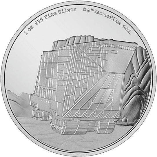 Die zweite Ausgabe der limitierten „Vehicles™“ Serie ist dem Sandcrawler™ gewidmet. Die einzigartige STAR WARS™ Sandcrawler™ Münze wurde aus einer Unze Feinsilber in Polierter Platte geprägt. Das gepanzerte Fahrzeug rollt durch eine Wüstenlandschaft, genauer gesagt über die Wüstenlandschaft von Tatooine™. Am oberen Rand befindet sich die Angabe von einer Unze 999er Feinsilber. Auch das offizielle Copyright von Lucasfilm Ltd.™ ist zu sehen.