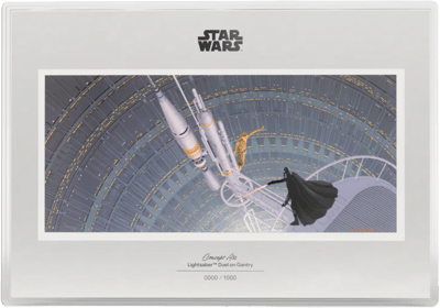 Was diese Silbermünzen so einzigartig macht? Das beeindruckende Querformat von 262 mm x 175 mm! Anders als klassische runde Münzen präsentiert sich dieses Sammlerstück im cinematischen Poster-Stil. Die Vorderseite zeigt die originale Konzeptkunst des dramatischen Duells auf der Laufsteg-Plattform in Cloud City – eingefasst von einem polierten Silberrahmen, der dem Stück eine galeriereife Ästhetik verleiht.