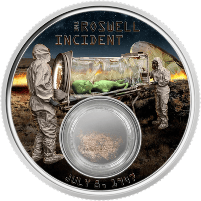 Noch heute wird heftig darüber diskutiert, was damals tatsächlich passiert ist. Es gibt unzählige Theorien und Berichte, unter anderem darüber, dass nicht nur ein UFO, sondern sogar Aliens gefunden wurden, die bei dem Absturz ums Leben kamen. Auf dem Motiv dieser Münze wird dargestellt, wie zwei Wissenschaftler in Anzügen den leblosen Körper eines Aliens wegtransportieren.